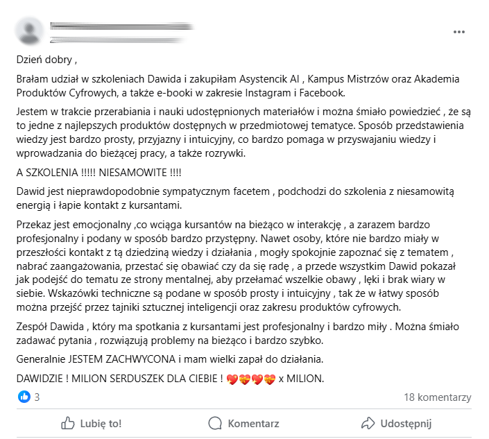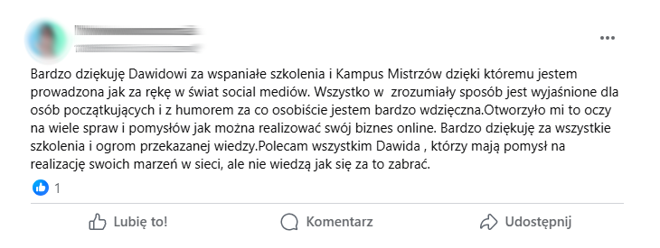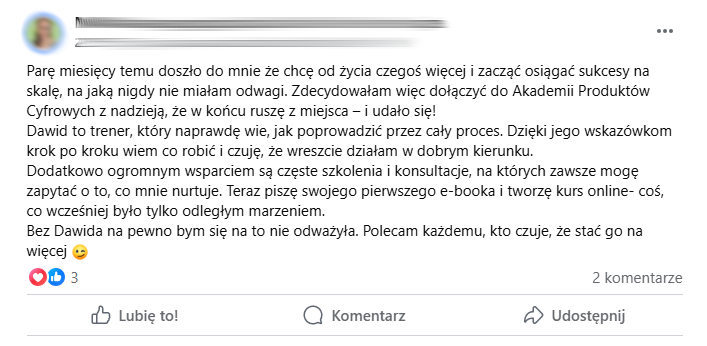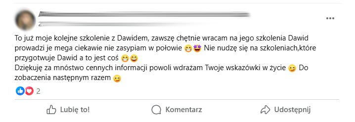 Od ponad dekady wspieram przedsiębiorców w budowaniu marki osobistej, skutecznym marketingu i skalowaniu biznesów. Jestem autorem Rocznej Szkoły z Dawidem, gdzie uczę jak zbudować skuteczny biznes online w 1 rok, a także twórcą platform takich jak Kampus Mistrzów, Insta Mistrz i Akademia Produktów Cyfrowych.