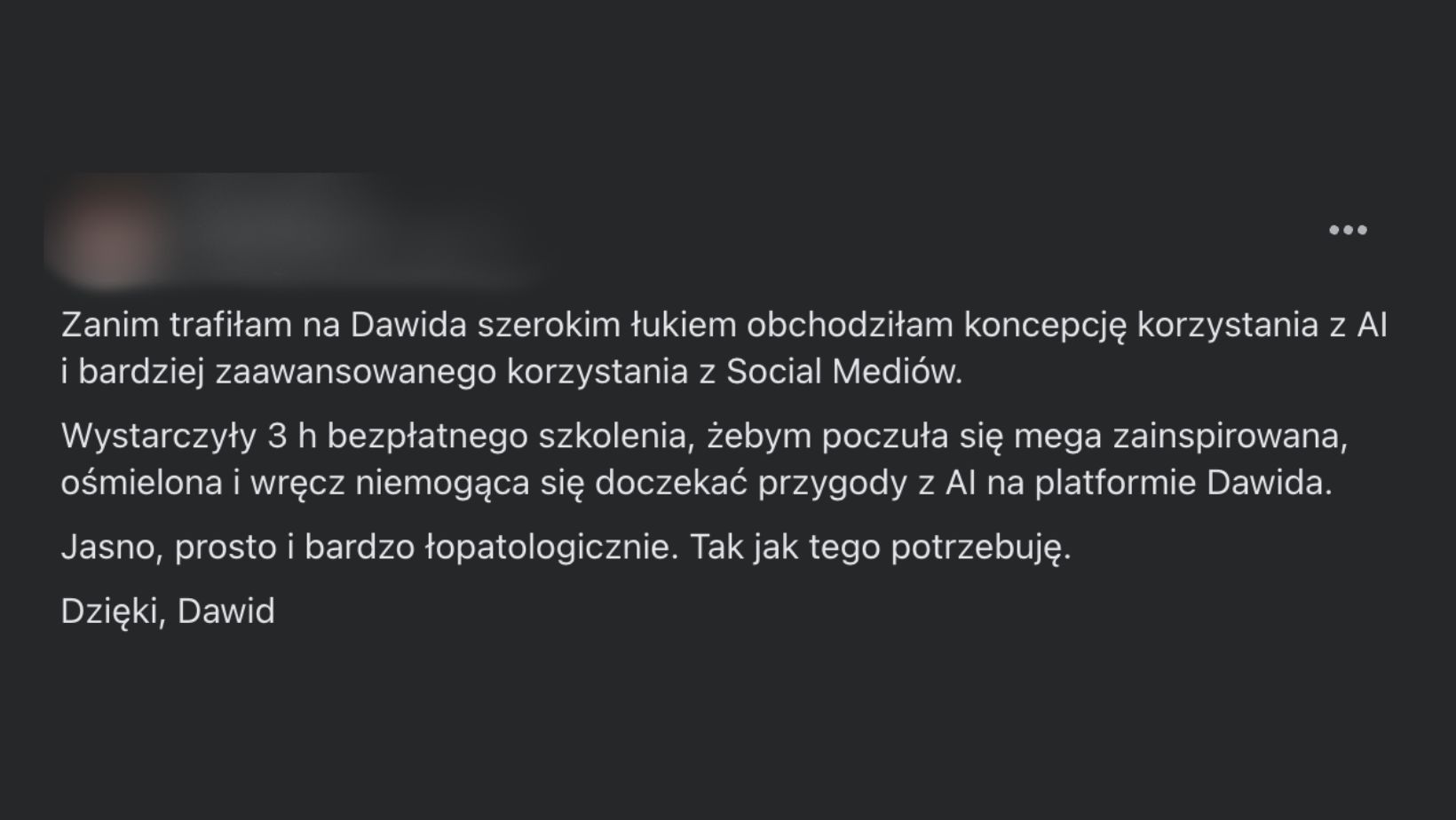 "Miałam przyjemność uczestniczyć w szkoleniu prowadzonym przez Dawida Pasternaka na temat social mediów i sztucznej inteligencji. Spotkanie było świetnie przygotowane merytorycznie, z dużym naciskiem na praktyczne zastosowania. Dawid ma rzadką umiejętność przekazywania wiedzy w sposób zrozumiały, konkretny i angażujący. Zdecydowanie polecam – warto."