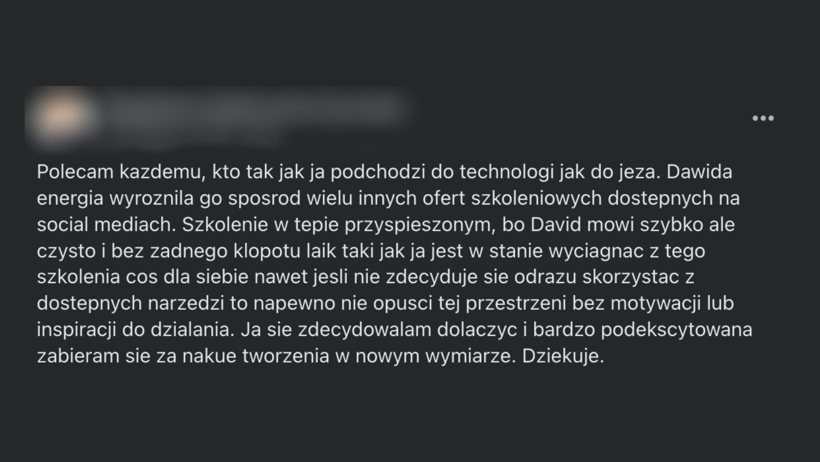 "Polecam szkolenia Dawida. Dużo ciekawych treści przekazanych w bardzo przejrzysty sposób. Trochę nowości i sporo podpowiedzi. Na pewno nie będzie to stracony czas wręcz przeciwnie może zaprocentować w przyszłości. Trzeba tylko chcieć.