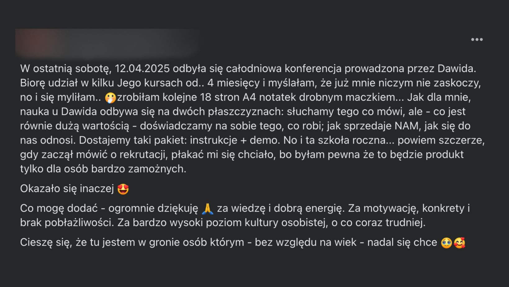 "Szkolenia z Dawidem to coś niesamowitego😊 warto poświęcić każdą minutę na coś co może zmienić czyjeś życie🥰 mnóstwo motywacji, gdzie odrazu się chce wstać i działać💪🏻 kursy z Dawidem to wielka mądrość, dzieli się z nami wielkim doświadczeniem i ogromną wiedzą 💪🏻 polecam każdemu!!! ❤️❤️❤️"